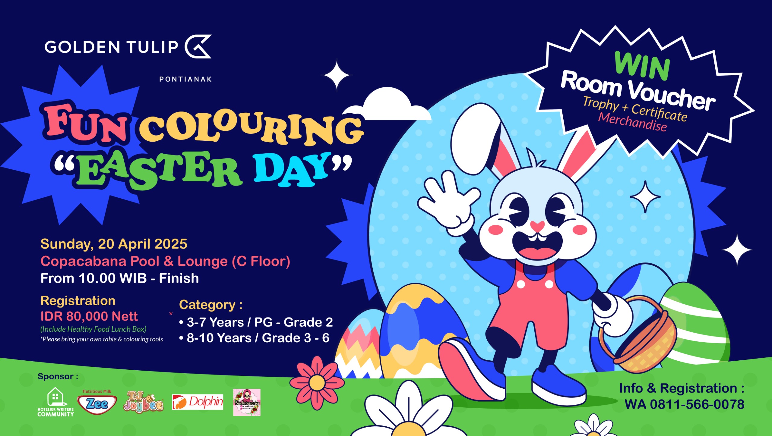 Acara Fun Coloring “Easter Day” dengan pendafrtaran seharga Rp. 80.000 per- peserta, peserta akan mendapatkan wawasan dan teman baru sekaligus mendapatkan hadiah menarik yang akan diberiksn oleh Hotel Golden Tulip Pontianak. Adapun, event ini akan dilaksanakan di are Copcabana Pool & Lounge (Lantai C).