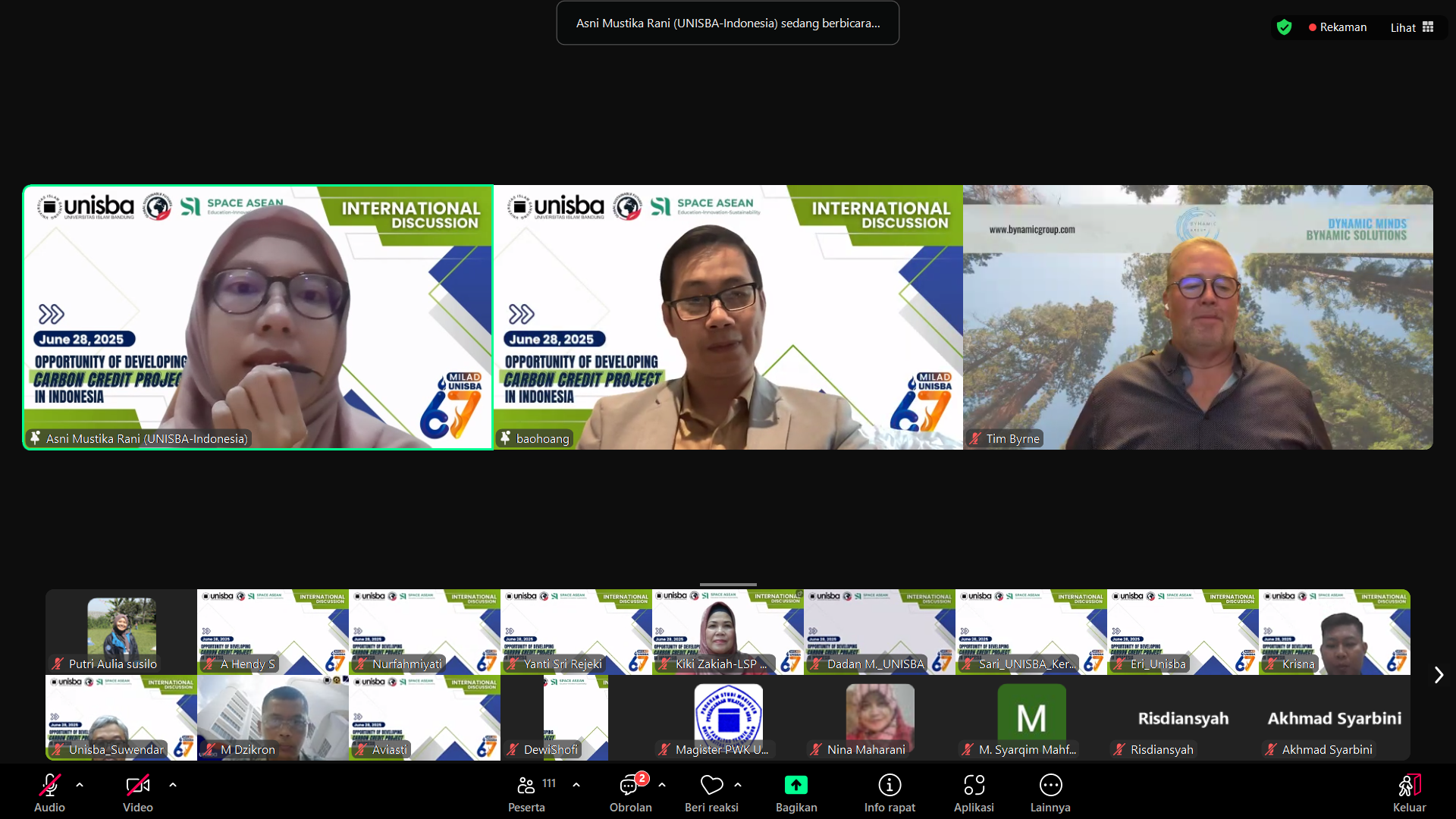 KORANPUBLIKA.CO.ID|Bandung,- Universitas Islam Bandung (Unisba) menyelenggarakan International Discussion bertajuk Opportunity of Developing Carbon Credits Project in Indonesia pada Sabtu, 28 Juni 2025. Kegiatan ini dilaksanakan secara daring melalui Zoom Meeting, dan menjadi salah satu rangkaian peringatan Milad ke-67 Unisba, Selasa(1/7/2025).