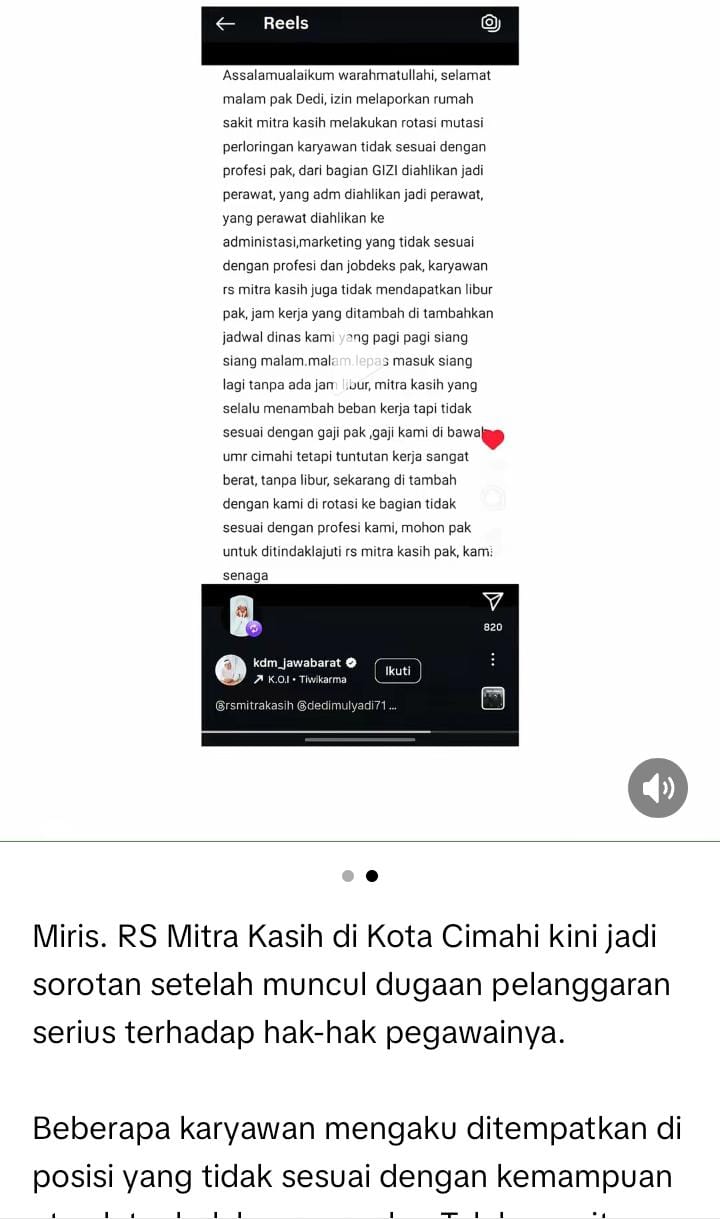 KORANPUBLIKA.CO.ID|Cimahi,- Rumah Sakit Mitra Kasih Kota Cimahi tengah menjadi sorotan publik setelah sejumlah unggahan viral di media sosial mengungkap dugaan pelanggaran etika kerja terhadap tenaga kesehatan dan staf pendukung. Unggahan tersebut memicu gelombang diskusi di TikTok, Instagram, dan X (Twitter), dengan tagar #EtikaKerjaRS dan #UMRCimahi trending sejak Jumat malam, Minggu(19/10/2025).