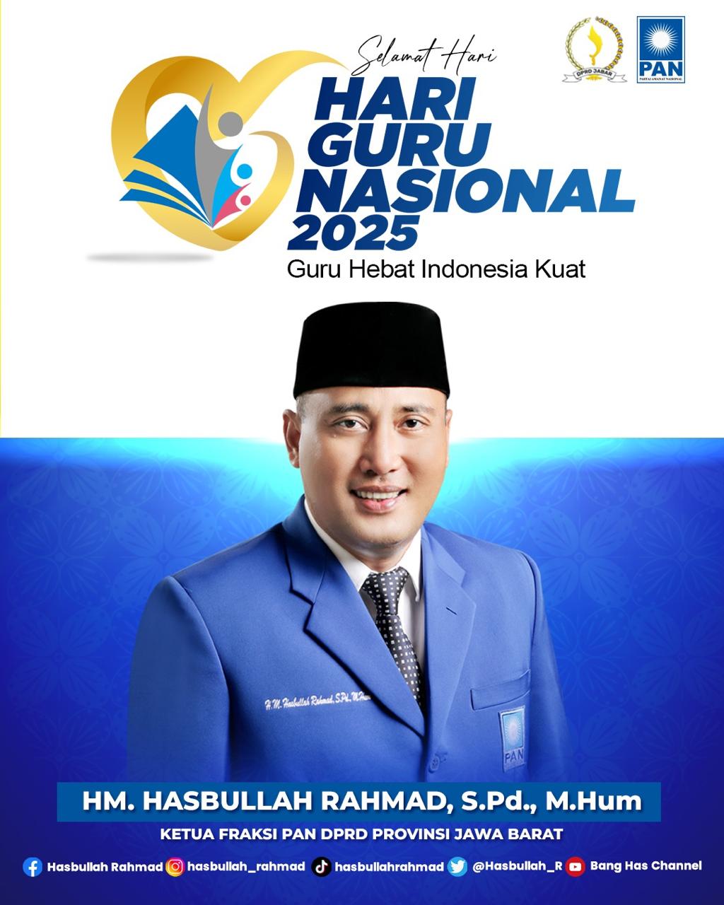 Dalam momentum peringatan Hari Guru Nasional, Anggota DPRD Jawa Barat dari Fraksi PAN, H. M Hasbullah Rahmat, S. PD., M. Hum, menyampaikan sejumlah catatan penting terkait nasib dan perlindungan bagi para guru, khususnya di Jawa Barat.