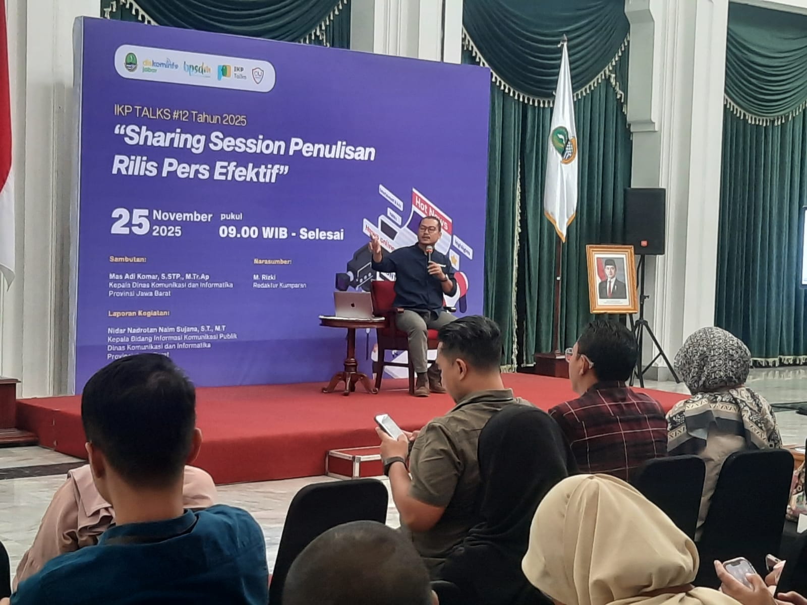 KORANPUBLIKA.CO.ID|Kota Bandung,- Dinas Komunikasi dan Informatika Provinsi Jawa Barat menggelar IKP Talks #12, Sharing Sesion Penulisan Rilis Pers Efektif, Selasa (25/11/2025) di Aula Timur Gedung Sate, Kota Bandung. Selain digelar luring, IKP Talks juga diikuti secara daring oleh pranata humas di kabupaten dan kota di Jabar melalui zoom dan YouTube.