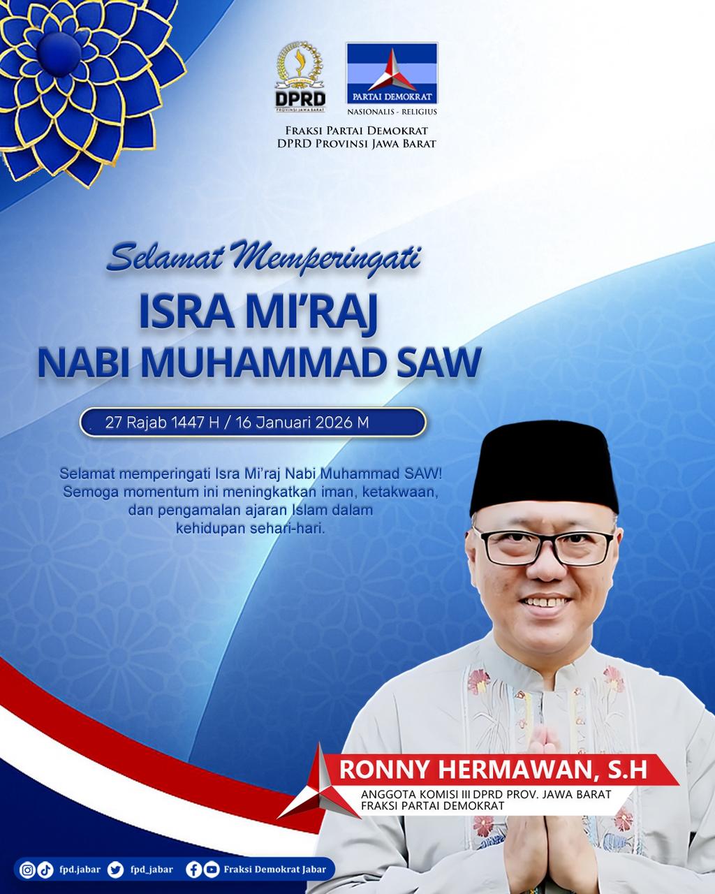 KORANPUBLIKA.CO.ID|Bandung,- Anggota DPRD Provinsi Jawa Barat dari Fraksi Partai Demokrat, Ronny Hermawan, S.H, mengajak masyarakat untuk menjadikan peringatan Isra Mi’raj Nabi Muhammad SAW 1447 Hijriah sebagai ajang memperkuat nilai-nilai keagamaan, etika sosial, dan kepedulian terhadap sesama, Kamis(15/1/2026).