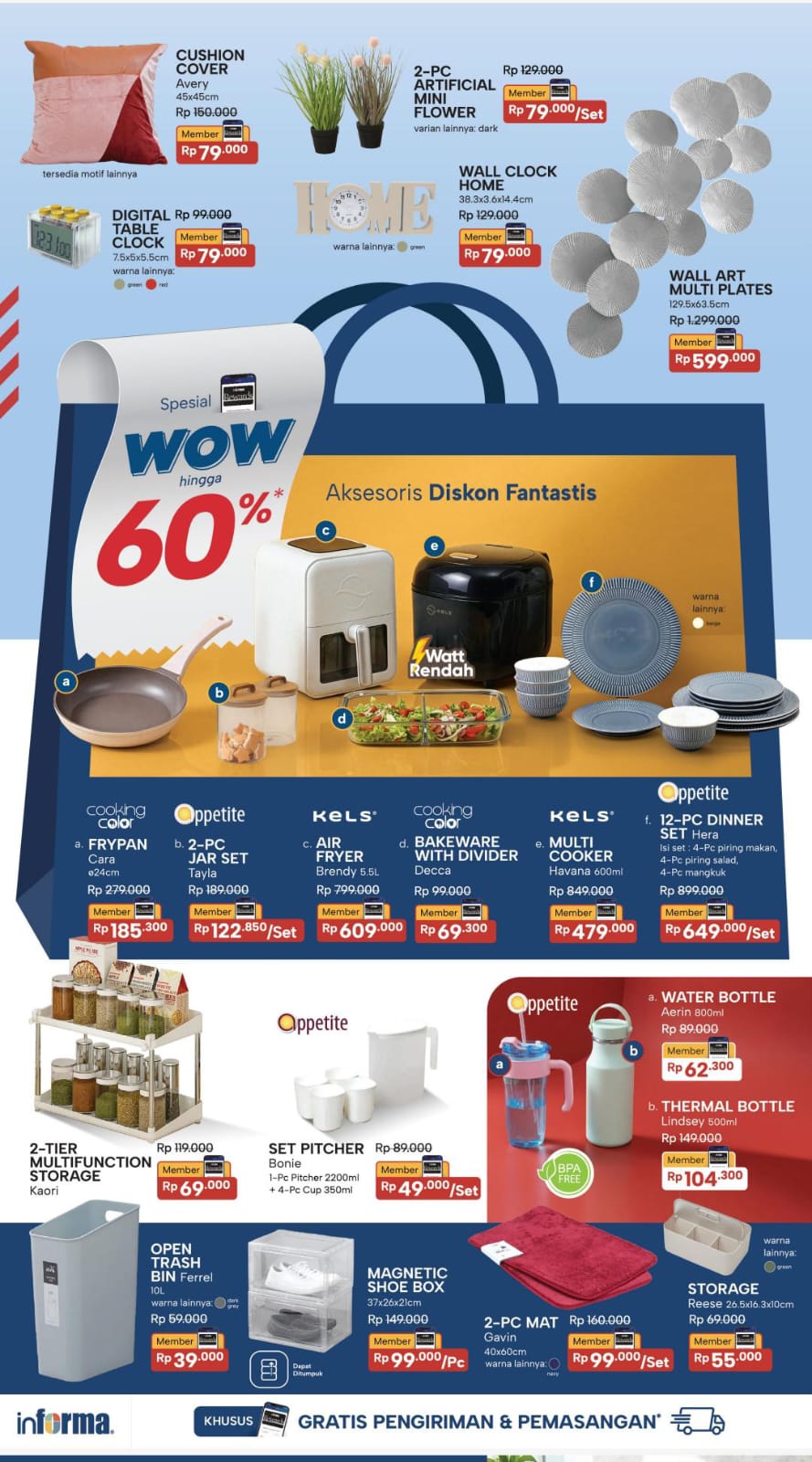 Menambah daya tarik program ini, INFORMA juga menghadirkan promo Beli 1 Gratis 1 untuk berbagai kategori produk, mulai dari kursi, rak pajangan dan penyimpanan, hingga nakas dan kotak makanan berbahan kaca, memberikan nilai lebih dalam setiap pembelian. Sobat INFORMA juga dapat memanfaatkan program WOW Tebus Poin melalui INFORMA Rewards untuk mendapatkan berbagai produk pilihan, mulai dari rak serbaguna, matras lipat, ragam meja dan kursi, hingga aksesoris rumah tangga lainnya, menjadikan pengalaman belanja semakin hemat dan menguntungkan. Dengan berbagai pilihan produk dan penawaran yang dihadirkan, Early WOW SALE menjadi momen tepat untuk mendapatkan produk berkualitas dengan harga paling hemat, dalam periode 10 hari.